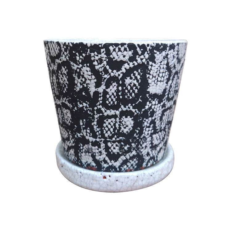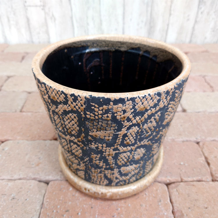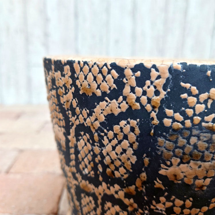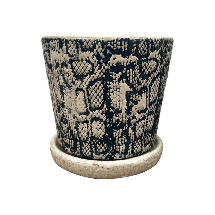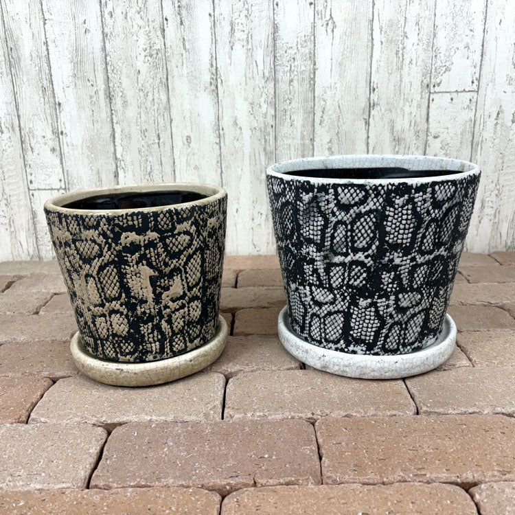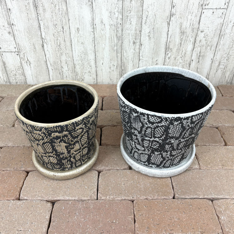 ヘビ革を表現した珍しい植木鉢。ホワイト、ベージュの2色のカラーをご用意しました。 インパクトのある見た目ですが、カラーリーフとの相性が良く。アンスリウムやミクロソリウム、アジアンタム、カラテアなど組み合わせてみてはいかがでしょうか?
