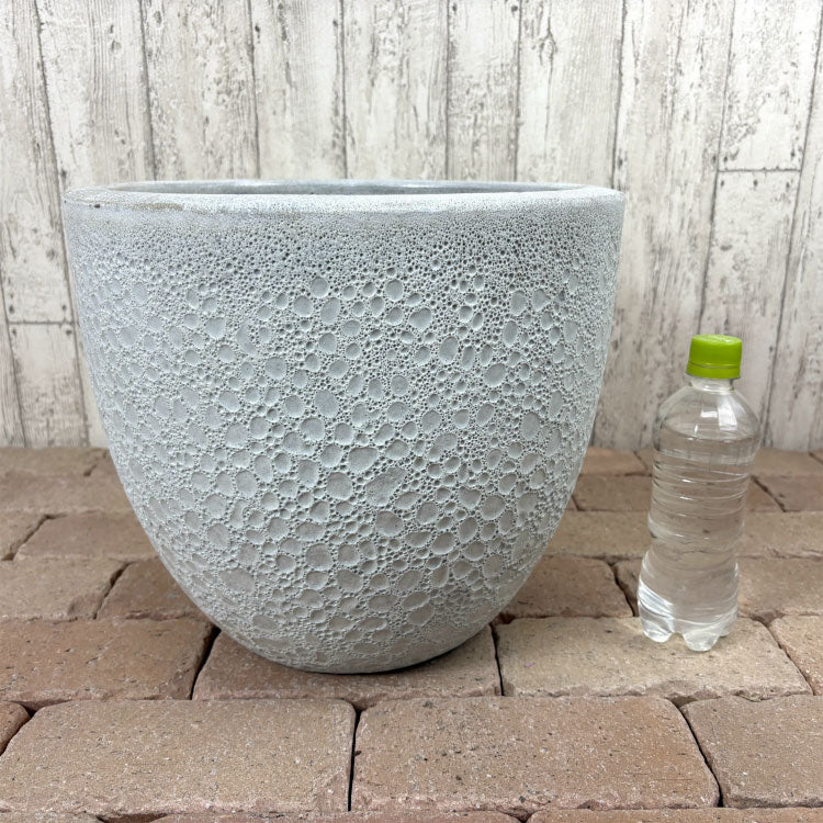 ザラザラとした手触りの大きな陶器の植木鉢。月面のような模様が化粧面全体に浮かび上がり、一点一点が異なる表情を見せてくれます。同じものが二つとない焼き物の奥深さ、趣きを存分に楽しむにはうってつけ! 色は深みのあるブラック、ネイビーとホワイトの3種類をご用意。堅牢で重厚、特に屋外でのご使用に向いています。