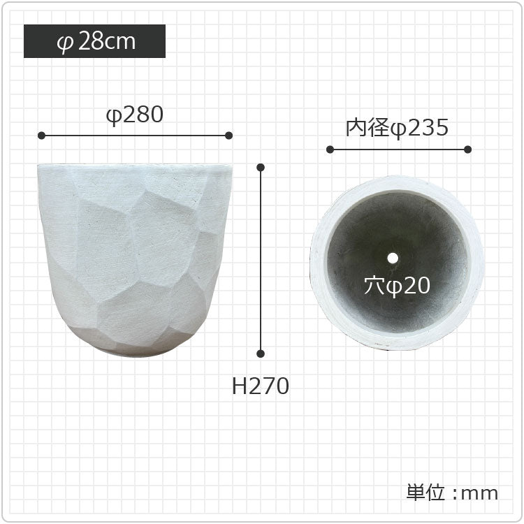 グラスファイバーをベースに石の粉を配合して作られたポリストーン製。軽量ですが重厚感のある佇まいが魅力的な植木鉢です。