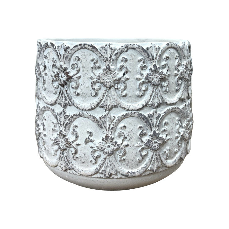 ギリシャ彫刻の様な模様が特徴的な植木鉢。使いやすいシリンダー型でちょっとした鉢カバーに最適です。