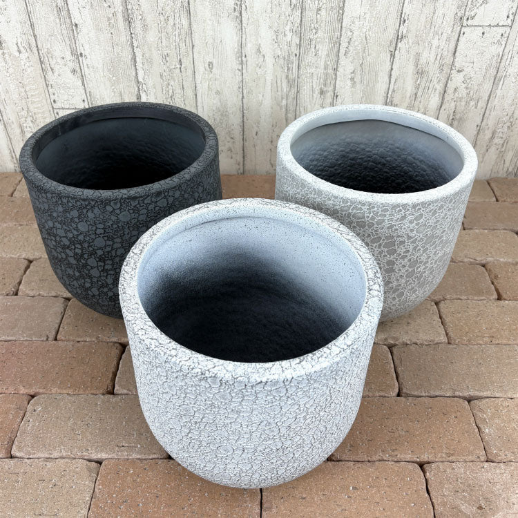 見た目に相反した軽さが特徴の植木鉢。頻繁に移動する必要がある場合や女性でも手軽に扱える点がポイントです。 ホワイト、ブラック、ライトグレーの3色をご用意。凹凸に沿ってホワイトはブラック、ブラックはホワイト、グレーはホワイトのウォッシュ加工がされており、立体感が良く表現されています。