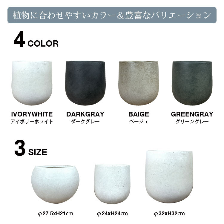 マットなコンクリート調の質感。表面はラフに拭きあげられたようなウォッシュ加工がされています。ニュアンスカラーの4色をご用意。シックな色味が植物を引き立ててくれます。