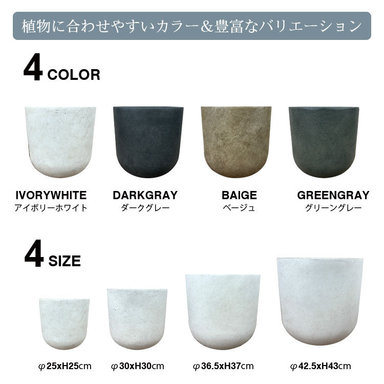 マットなコンクリート調の質感。表面はラフに拭きあげられたようなウォッシュ加工がされています。ニュアンスカラーの4色をご用意。シックな色味が植物を引き立ててくれます。