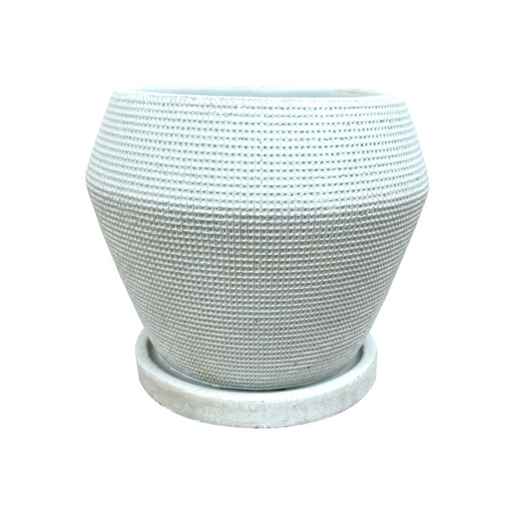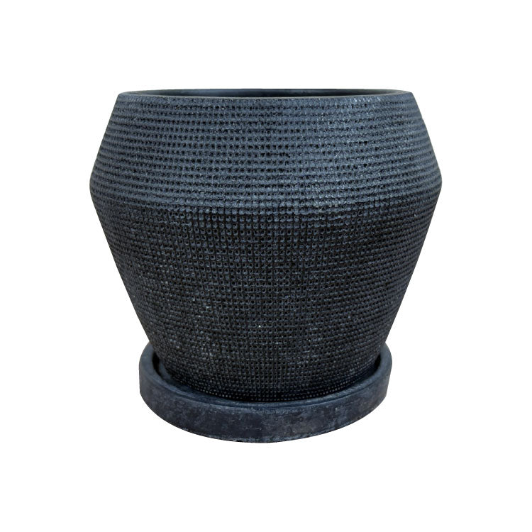 本体は全面に細かなメッシュ模様が施されザラザラとした質感。全体的には汚し加工がされており落ち着いた雰囲気です。 専用の受け皿もぴったりサイズで統一感があります。
