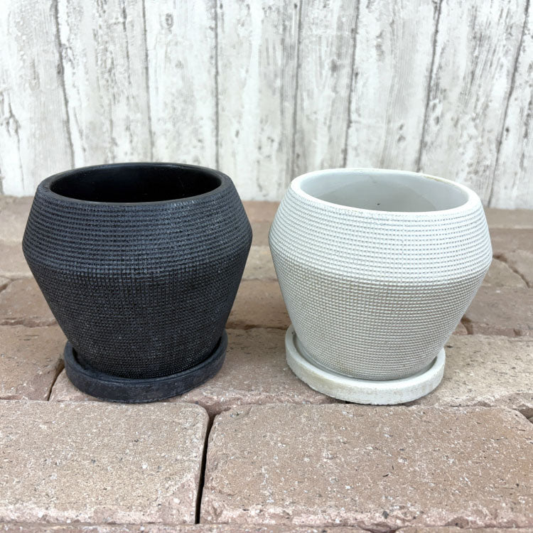 内側は丸型で使いやすいデザイン。3.5号、4.5号の2つのサイズをご用意しました。 専用の受け皿も付属しますが、簡易防水となっております。水やりの際はよく水を切ってから受け皿へお戻しください。