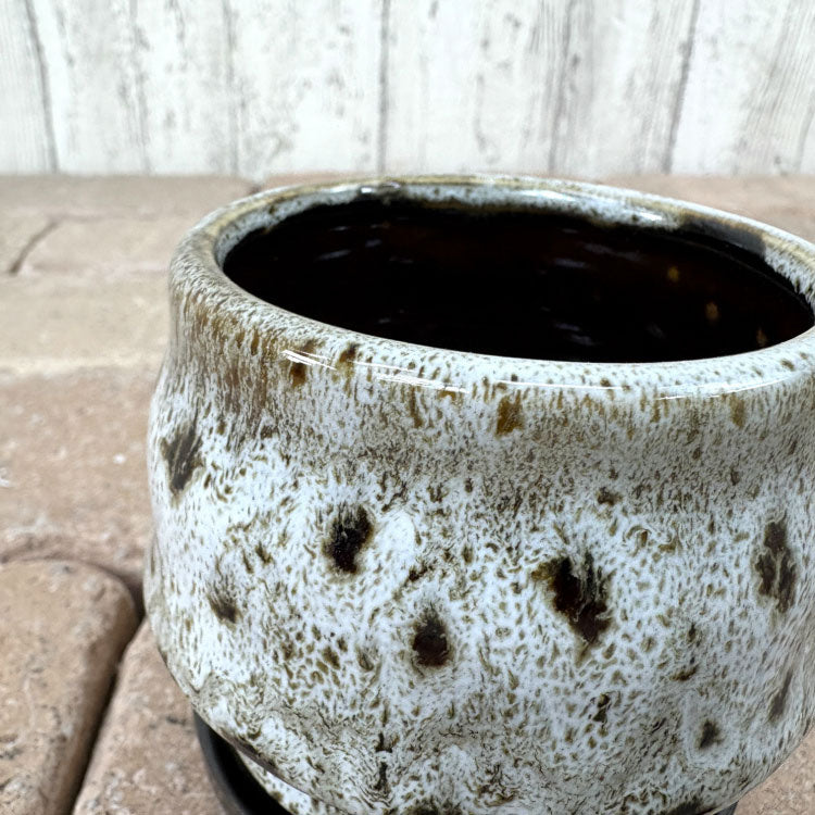 しっかりと塗られた釉薬が特徴的な陶器鉢。ツートンカラーになっており、下部分はブラウンで引き締まった印象です。デコボコした表面も手作り感がありおしゃれです。