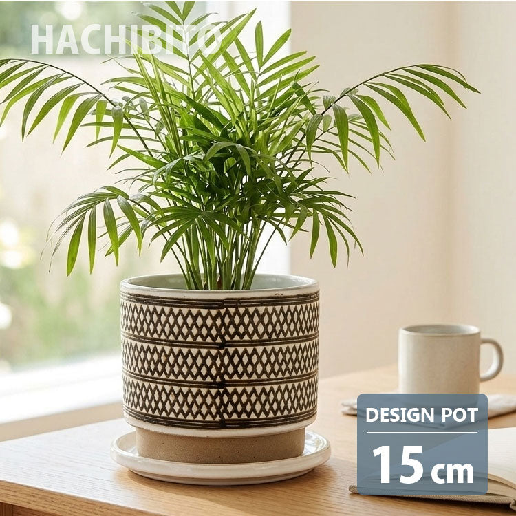 手描きのぬくもりを感じさせるダイヤ柄の彫りが、お部屋に心地よいリズムを生む一鉢です。 モノトーンを基調としながらも、裾部分に見える素朴な土の質感がアクセント。 どんなインテリアにも馴染みやすく、植物のグリーンを鮮やかに引き立てます。
