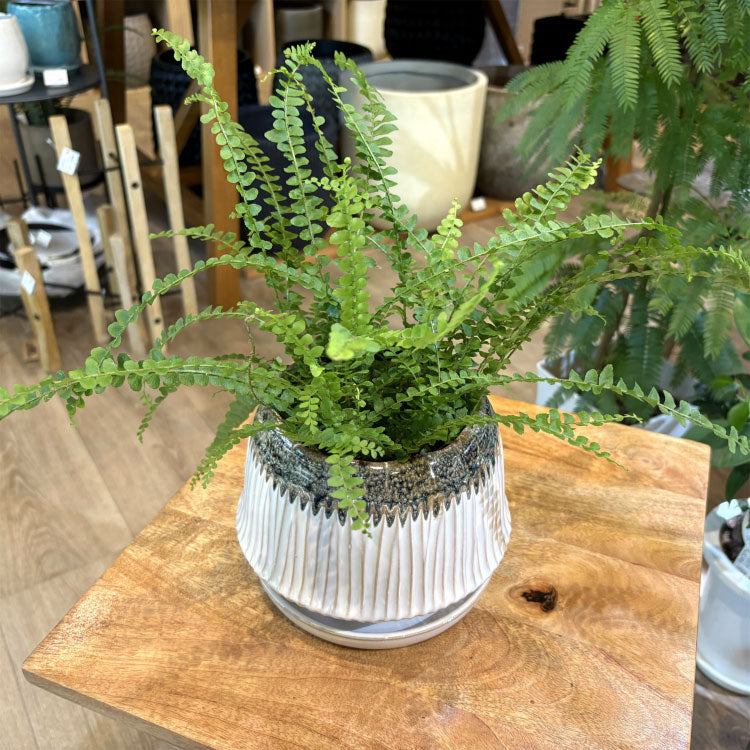 本体と同素材の専用受け皿が付属します。受け皿は小さく作られデザインの邪魔にならず一体感がございます。アジアンタムなどのシダ系の植物や、バーキンなど葉物との相性がよさそうです。