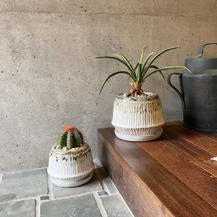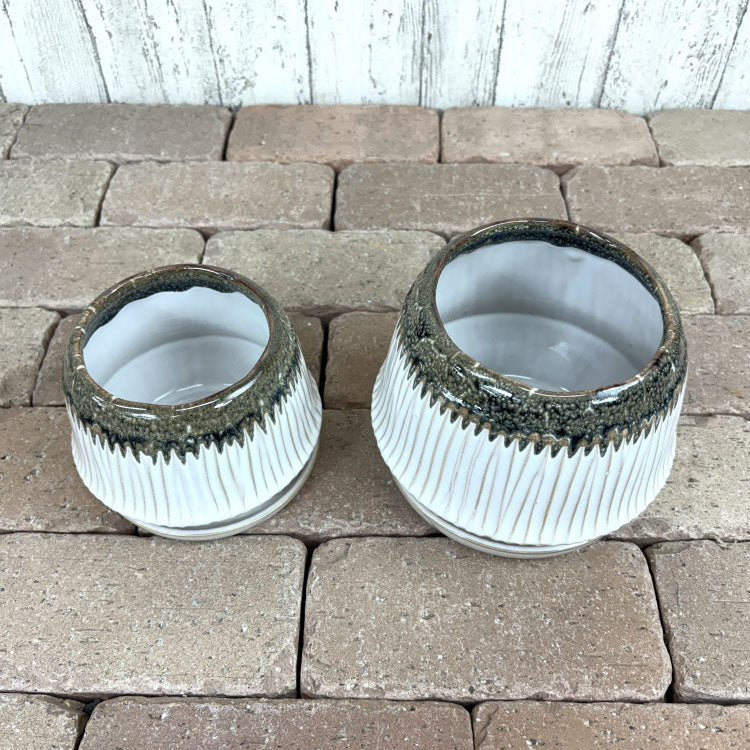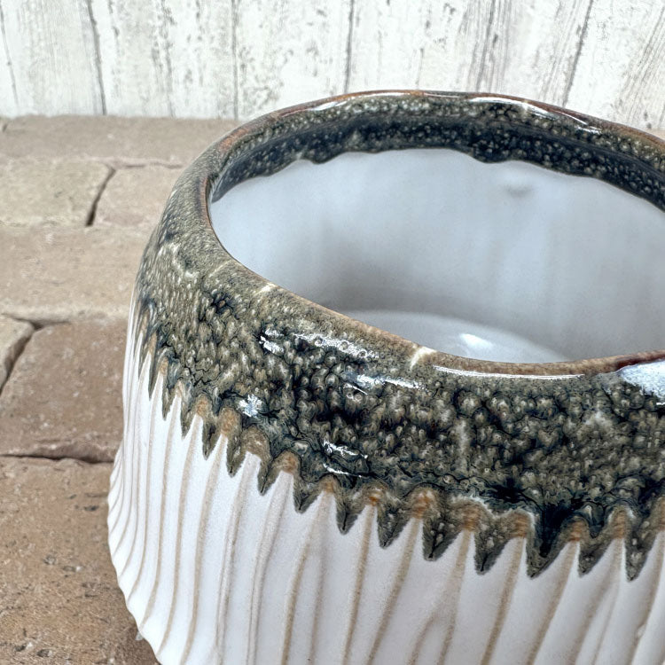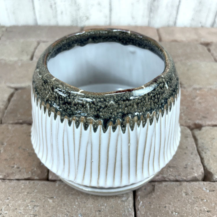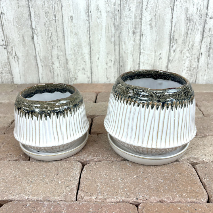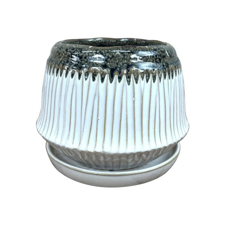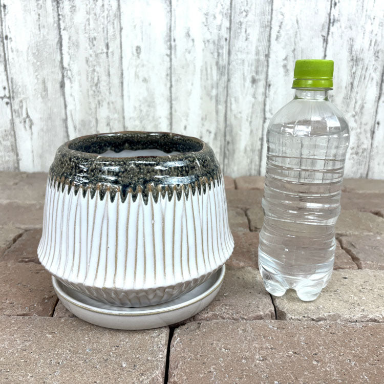 縦に細いラインを入れた植木鉢。ぽってりとした形で、ホワイトをベースに上部分はグレーのツートンカラーとなっています。