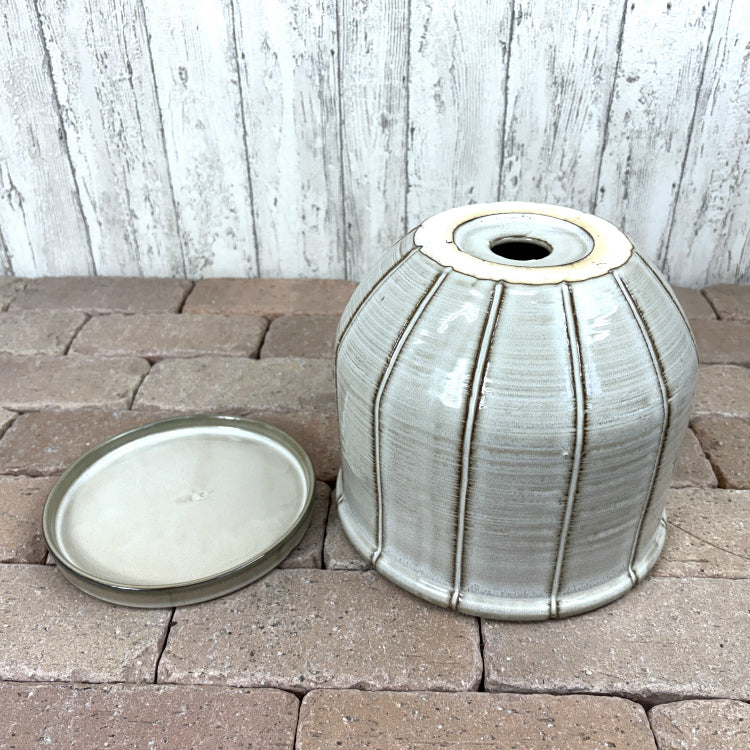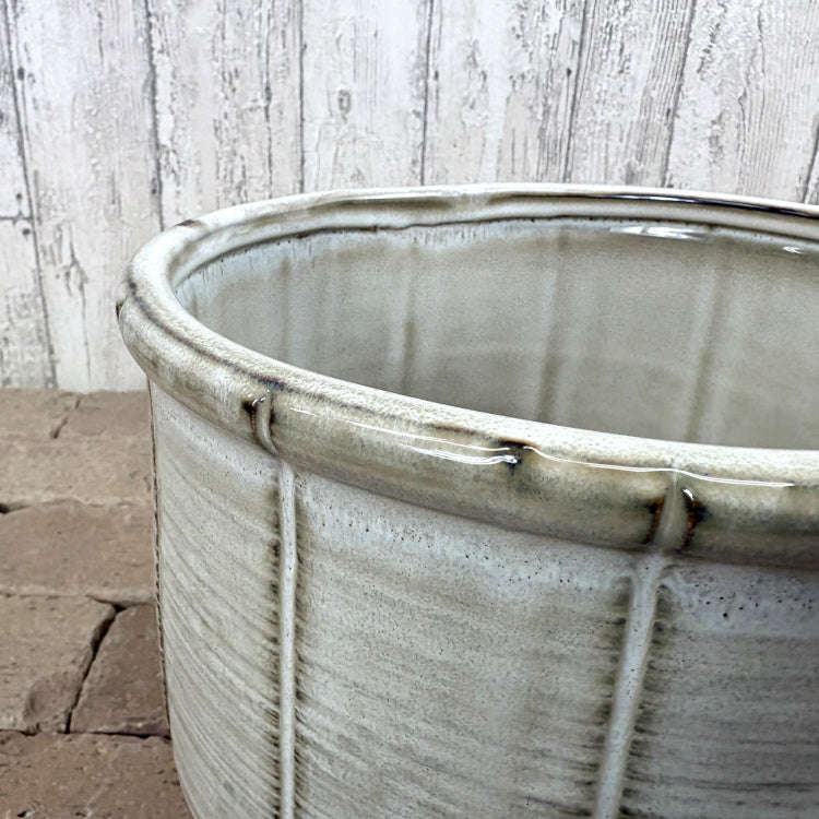 時を経たような、趣ある味わい深い表情が魅力の釉薬仕上げ。 シンプルなフォルムでありながら、計算された縦のスリットがアクセントとなり、光の反射によって豊かな陰影を生み出します。