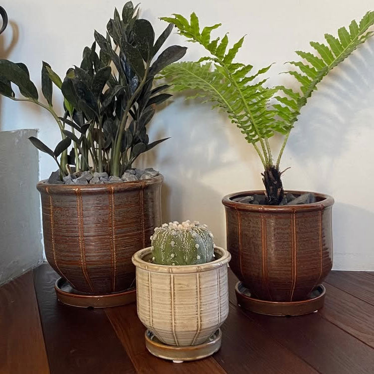 ぽってりとした艶感のある表面は、和・洋どちらのインテリアにも馴染むニュートラルな佇まい。 落ち着いたグレーや深みのあるブラウンのカラーバリエーションは、ガジュマルのような力強い幹や、サンスベリアのシャープな葉をより一層引き立ててくれます。