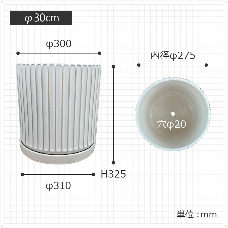 陶器製で重厚感のあるシリンダータイプ。同色の受け皿もセットで室内用の植え替え、鉢カバーのどちらにも扱いやすくなっています。内径は約27.5cm、8号用のカバーとして最適なサイズです。